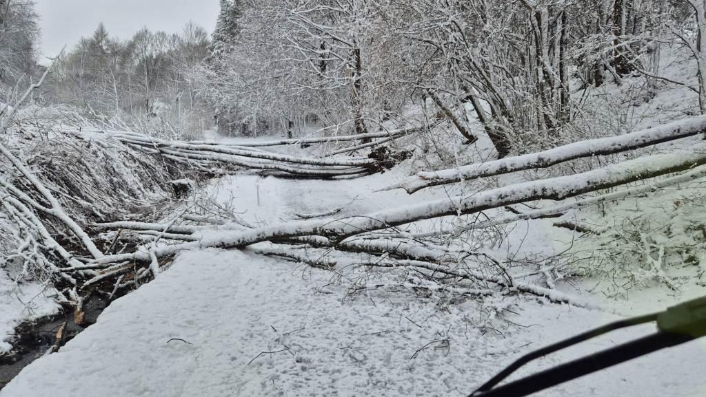 Der Winterdienst der Gemeinde informierte uns, dass der Güterweg Rotleiten | Redlschlag von mehreren umgestürzten Bäumen blockiert ist. Mit Unterstützung des Gemeindetraktors sowie eines priv. Traktors inkl. Rückewagen wurde mit den Aufräumarbeiten begonnen. Aufgrund des stürmischen Windes wurden diese Arbeiten jedoch abgebrochen und wir rückten um ca. 11:15 Uhr ins Feuerwehrhaus ein. Der Güterweg wurde behördlich gesperrt.