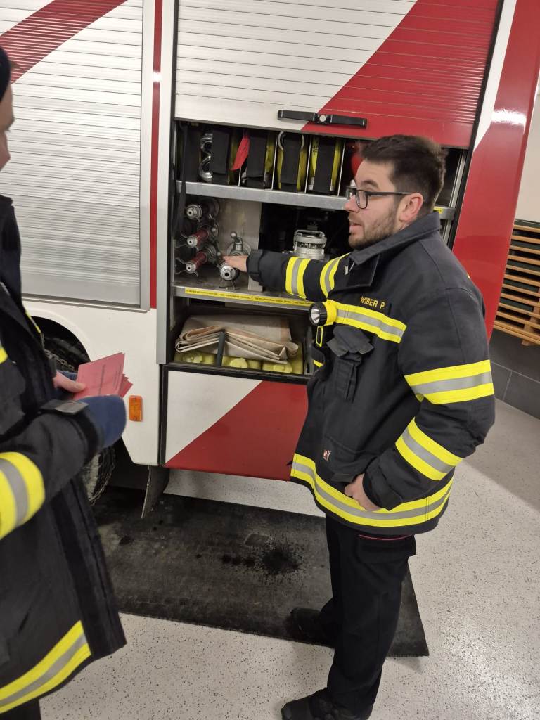 Ein weiterer Schulungspunkt war die Lagerung der Geräte im TLF. Jeder Teilnehmer musste, anhand der gezogenen Gerätekarten, den Lagerort zeigen. Ein sicheres bzw. schnelles Auffinden der Gerätschaften ist für eine erfolgreiche Einsatzbewältigung wichtig. Ausbildungsleiter BI Andreas Schlögl war mit dem Schulungsverlauf sehr zufrieden.