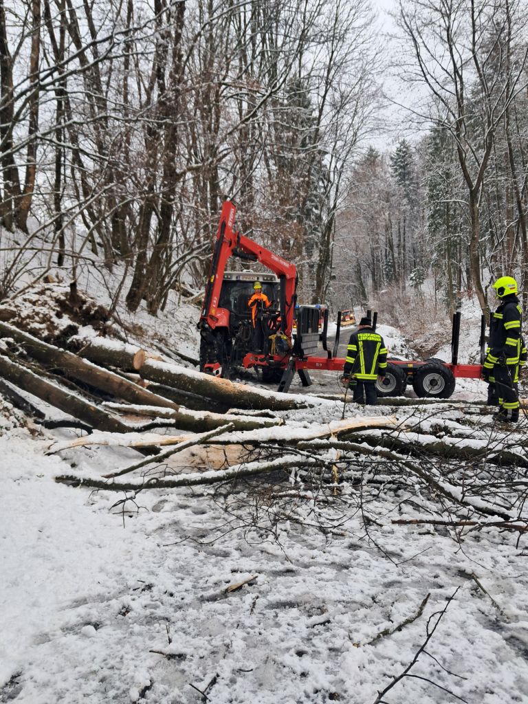 Der Winterdienst der Gemeinde informierte uns, dass der Güterweg Rotleiten | Redlschlag von mehreren umgestürzten Bäumen blockiert ist. Mit Unterstützung des Gemeindetraktors sowie eines priv. Traktors inkl. Rückewagen wurde mit den Aufräumarbeiten begonnen. Aufgrund des stürmischen Windes wurden diese Arbeiten jedoch abgebrochen und wir rückten um ca. 11:15 Uhr ins Feuerwehrhaus ein. Der Güterweg wurde behördlich gesperrt.